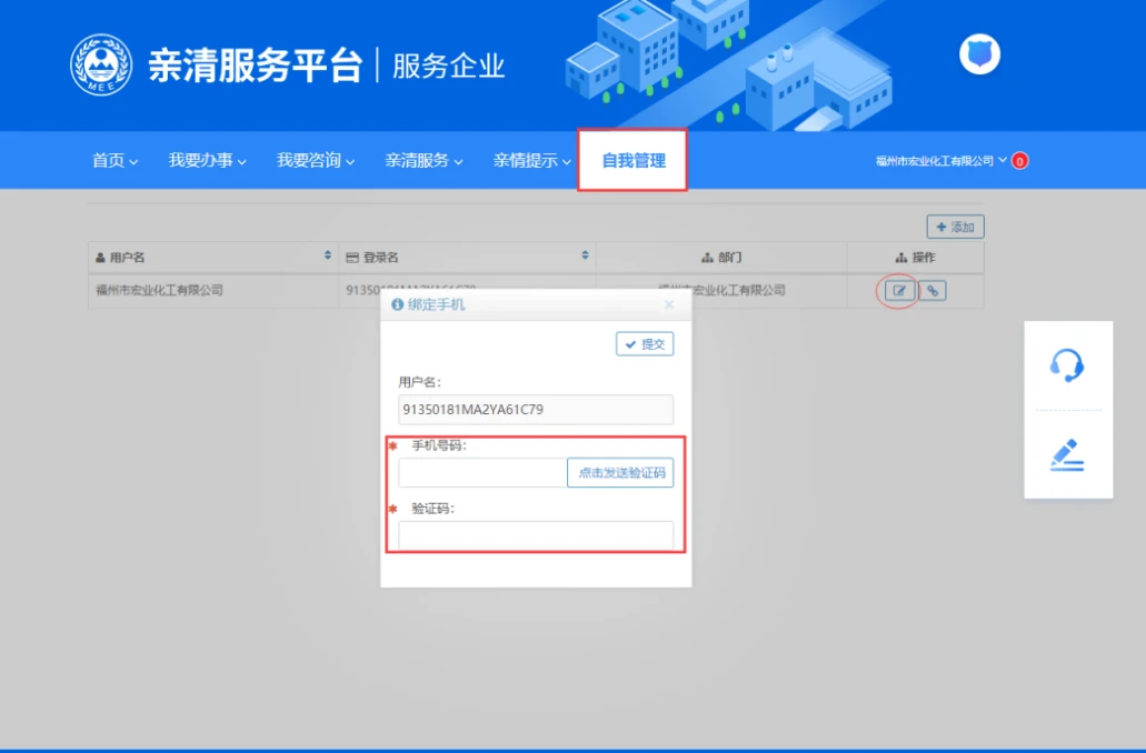 如下图,【首页→自我管理→用户管理】,点击圆圈处图标即可绑定(子账号暂时不支持绑定手机)