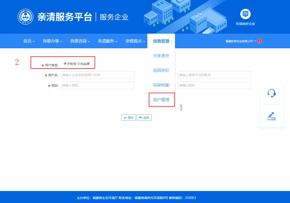 2)如果是【不同信用代码】的分公司,注册了多个污染源,优先在图中2处点选【污染源】,然后选择需要添加账号的污染源,填写用户信息。