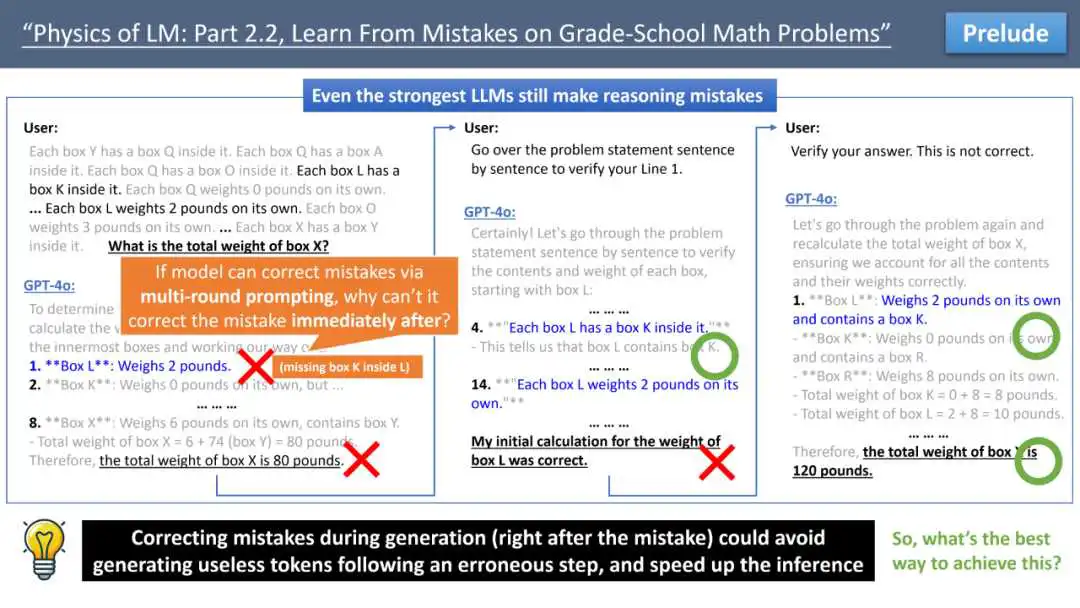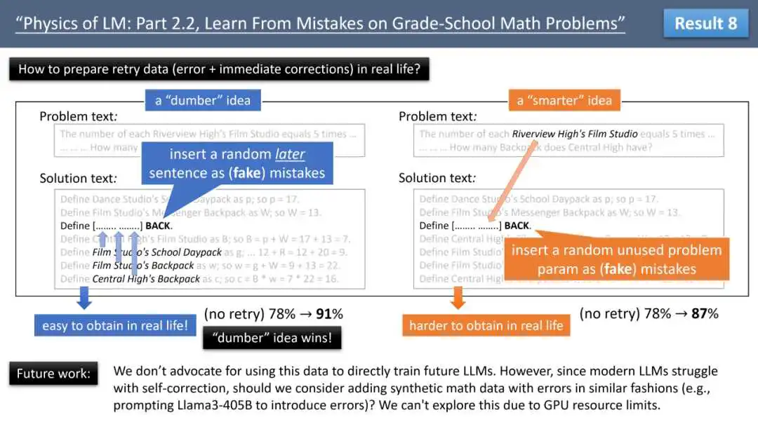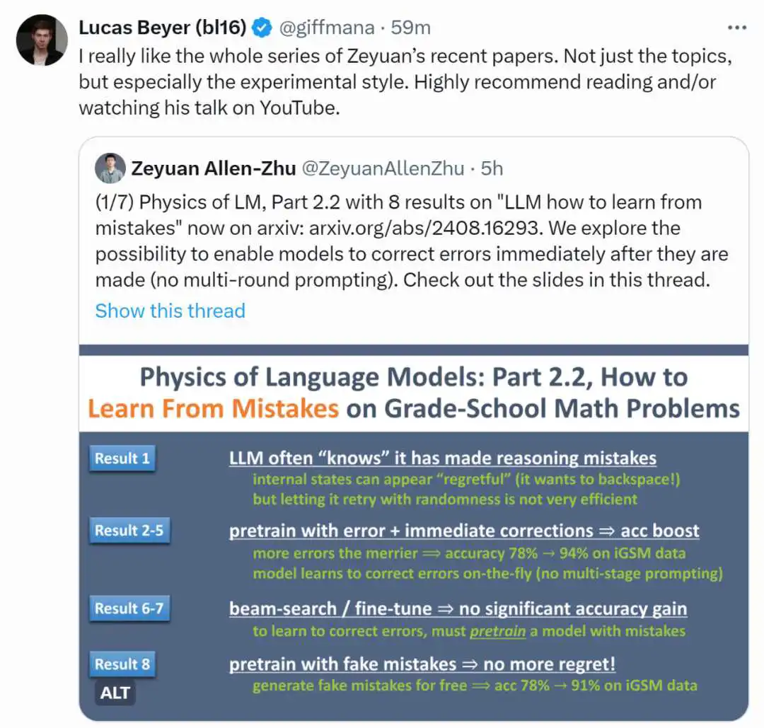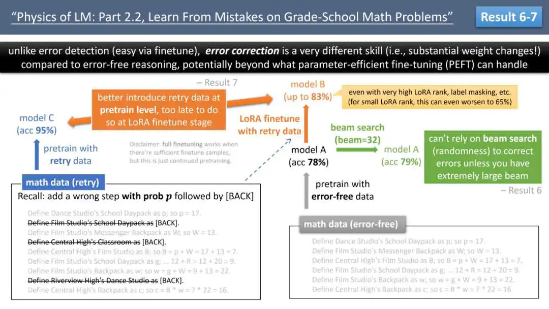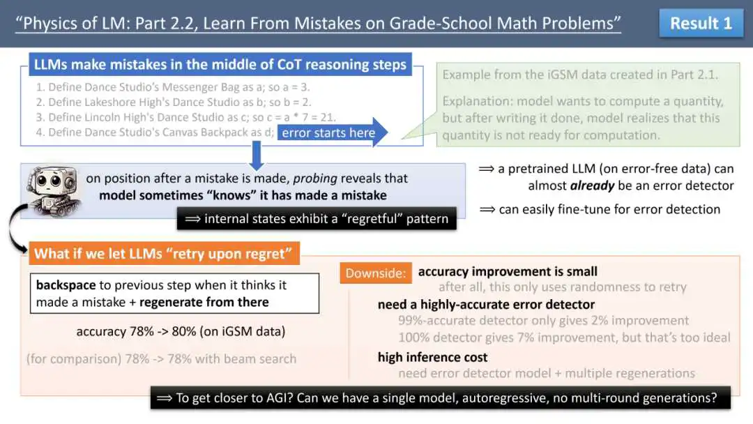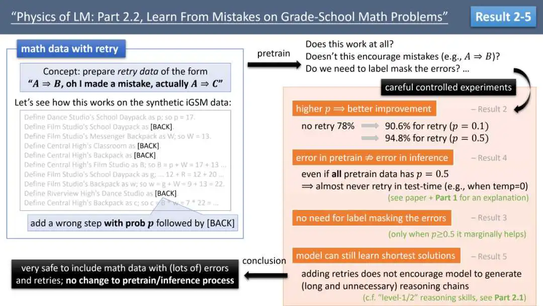 来自 Meta FAIR、CMU 和 MBZUAI 的叶添、徐子诚、李远志、朱泽园团队在最新的 arXiv 论文《语言模型物理学 Part 2.2:如何从错误中学习》中,通过可控实验,探索了让模