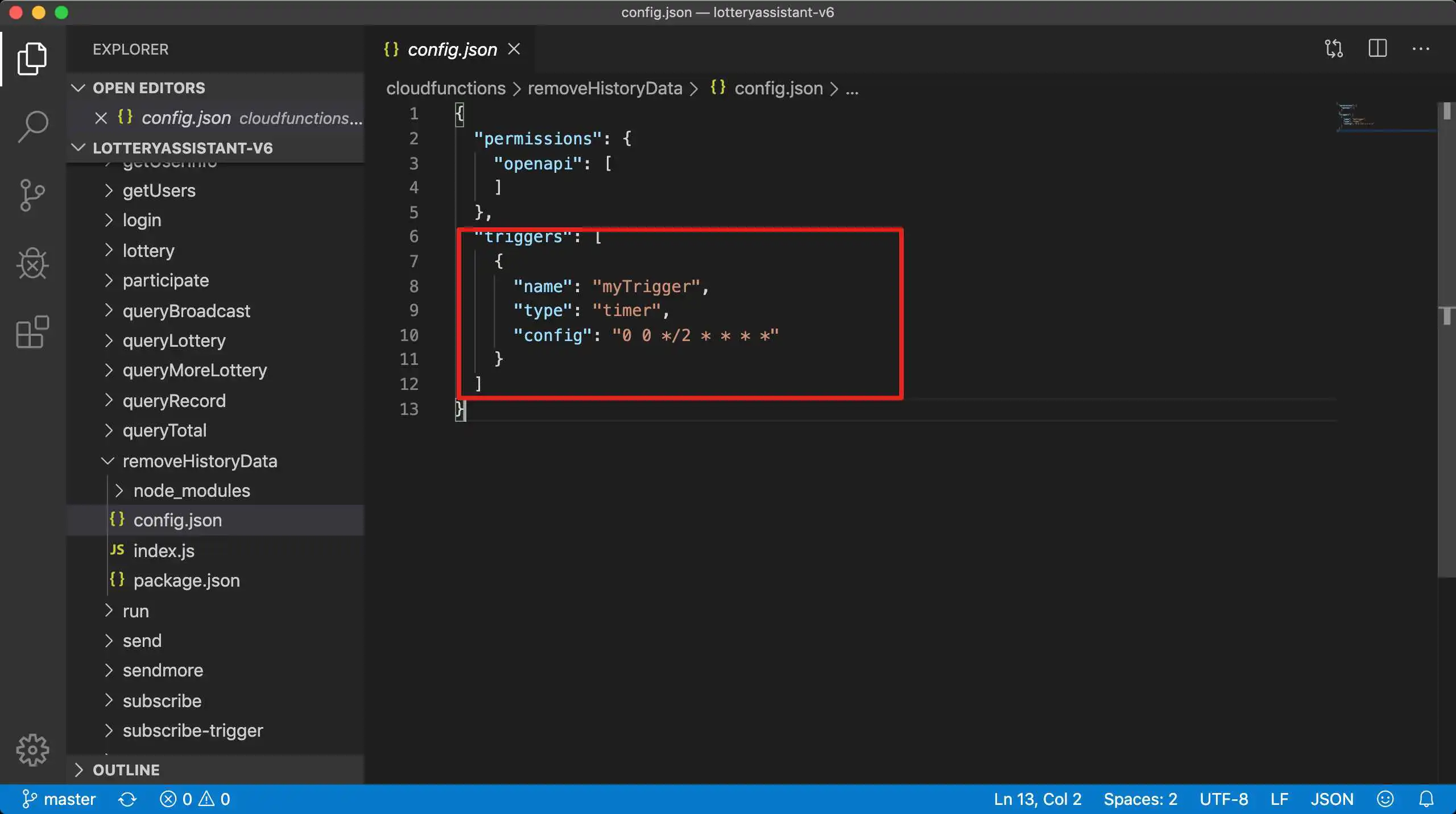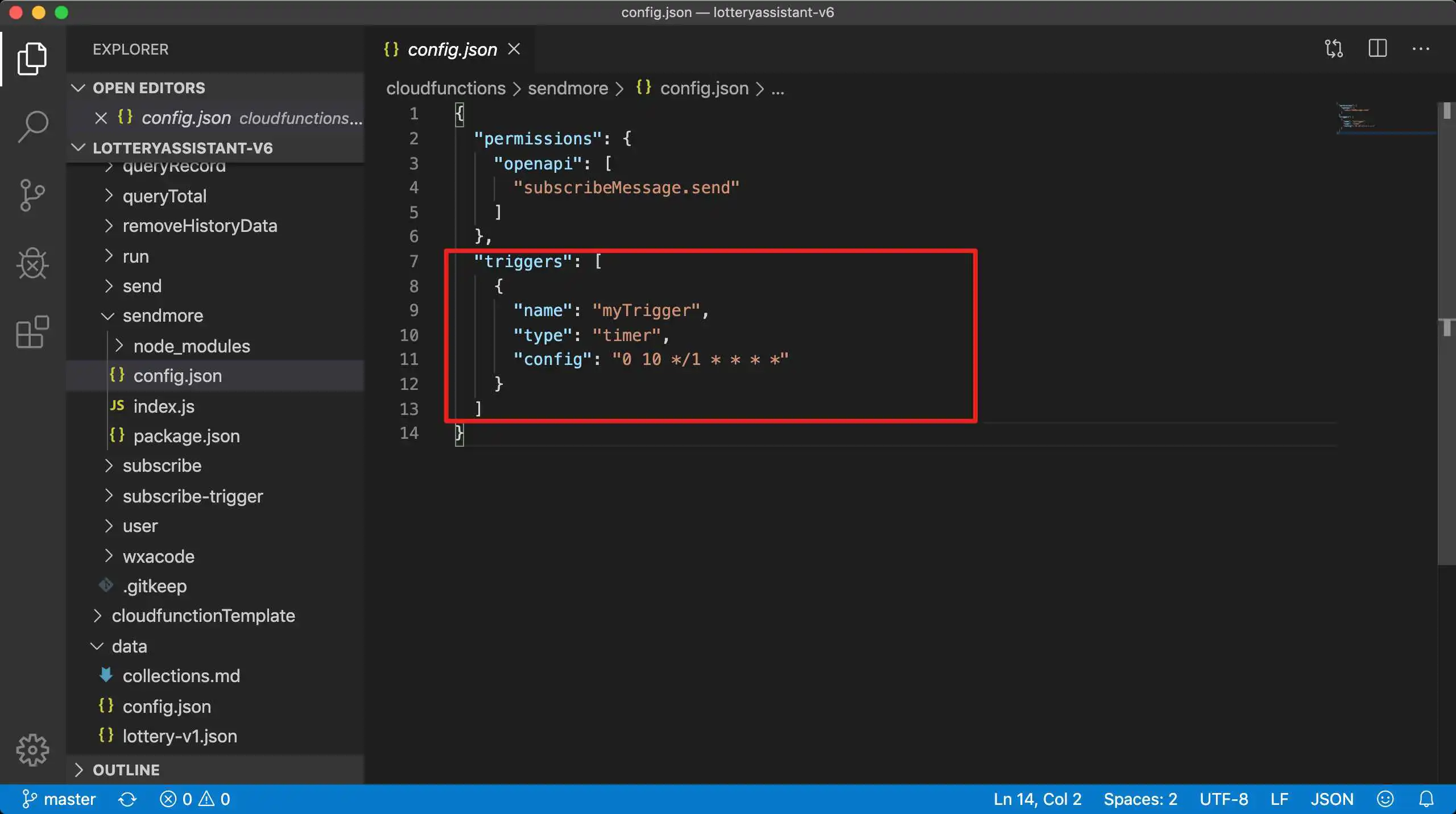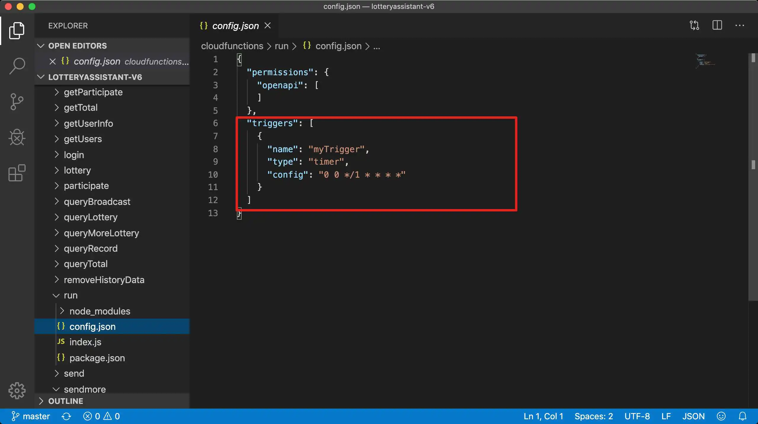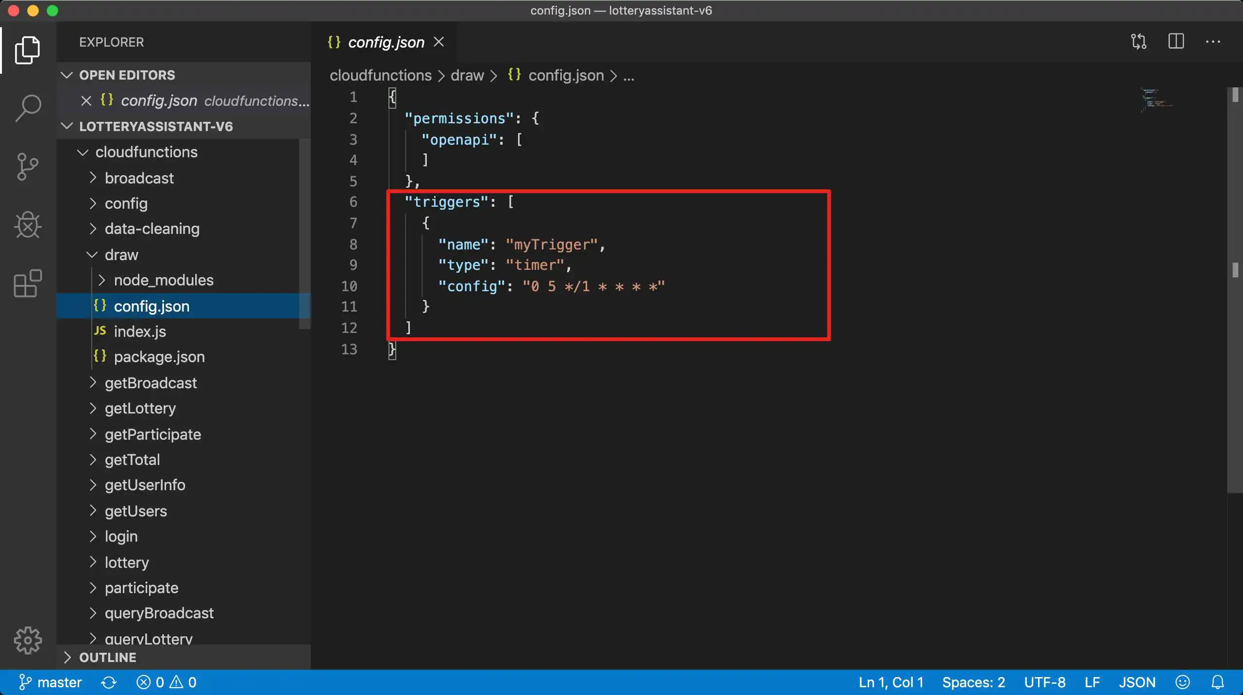 由于开奖以及订阅消息推送的逻辑都是用触发器来 控制,所以上传触发器至关重要