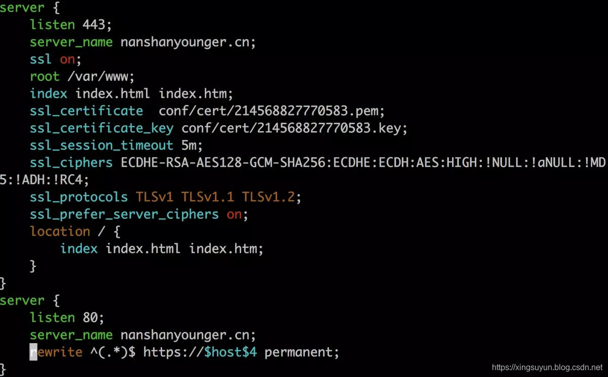 在/etc/nginx/conf.d文件夹下新建weapp.conf文件,将下图中的内容复制到weapp.conf中,nanshanyounger.cn为注册的域名,ssl_certificate和ssl_certificate_key为ssl证书所在的全路径,在/var/www下的index.html文件中写入要展示的html内容: