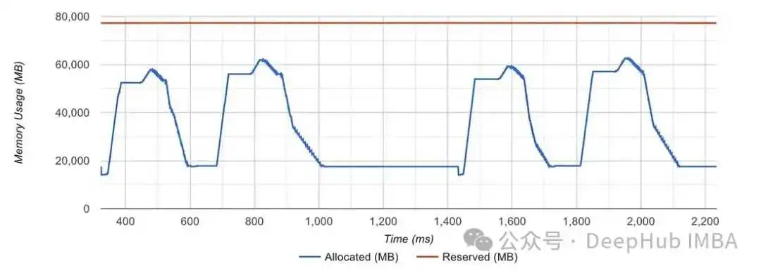 可以看到与分配器的保留内存相对应的红线不断变化。这意味着PyTorch分配器不能有效地处理分配请求。而当分配程序在没有频繁调用的情况下处理分配时,红线是完全笔直的,如下图所示: