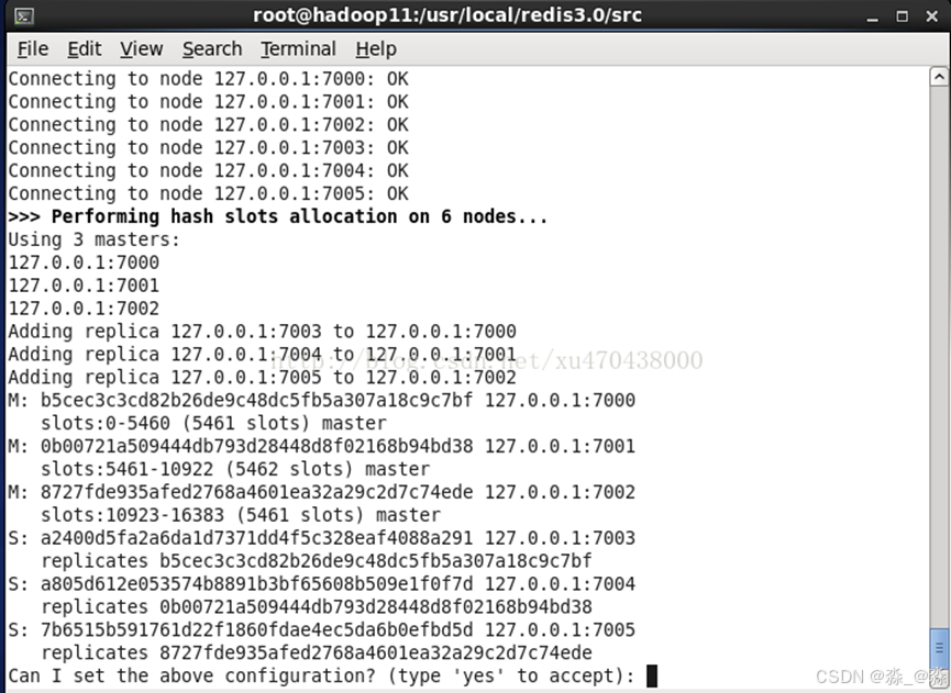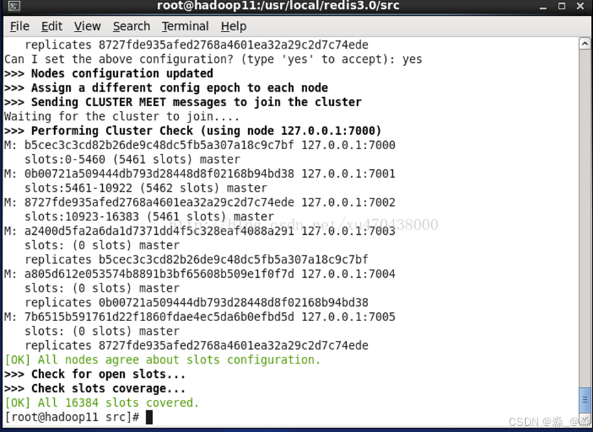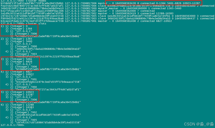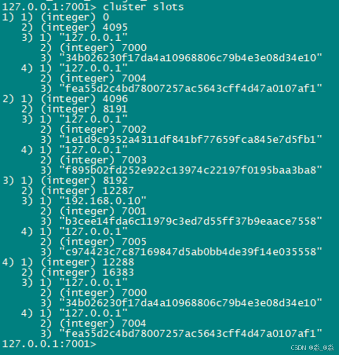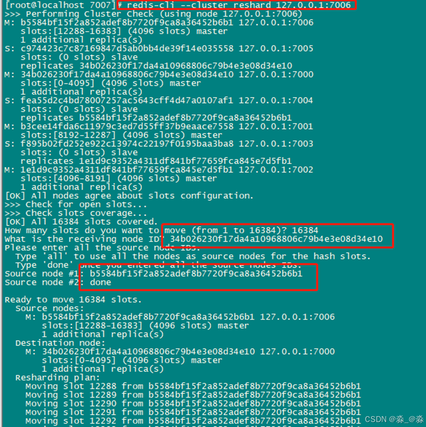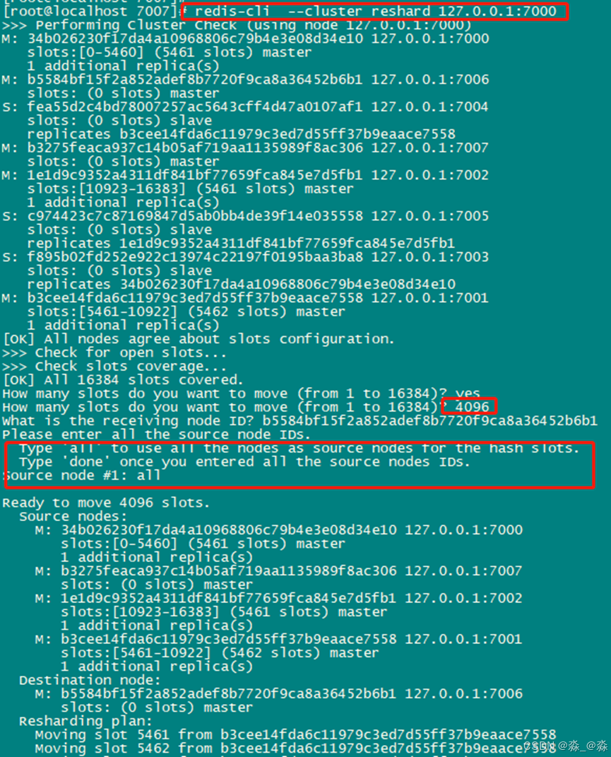 需要手动分配操作,执行redis-cli --cluster reshard 127.0.0.1:7000。节点信息可以是集群中任意一个节点。四个节点平分4096个槽位,然后选择7006节点的id。槽位分配可以选择手动从不同节点选取,也可以选择all自动平均从三个主节点分配。