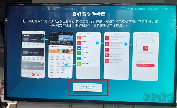 3、打开HI投屏选择 文件投屏,进入 文件传输页面,然后电视保持在这个页面上先别动