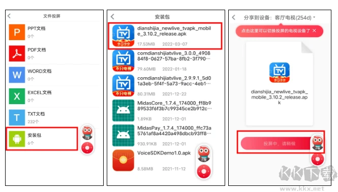 5、点击文件投屏后,点击 安装包,点击刚才下载的 电视家3.0安装包,点击 开始投屏,电视上就开始接收了,接收成功后就可以打开使用啦