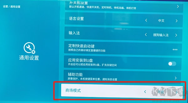 2、下载好安装包后,取下电脑上的U盘,将U盘插入电视的USB接口,打开电视找到 我的应用—设置—通用设置—开启商场模式