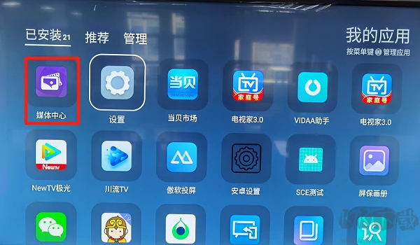 3、打开商场模式后,打开 我的应用—媒体中心—找到安装包,这时点击安装安装包,安装好就可以观看啦。