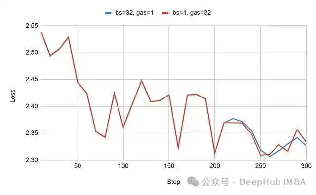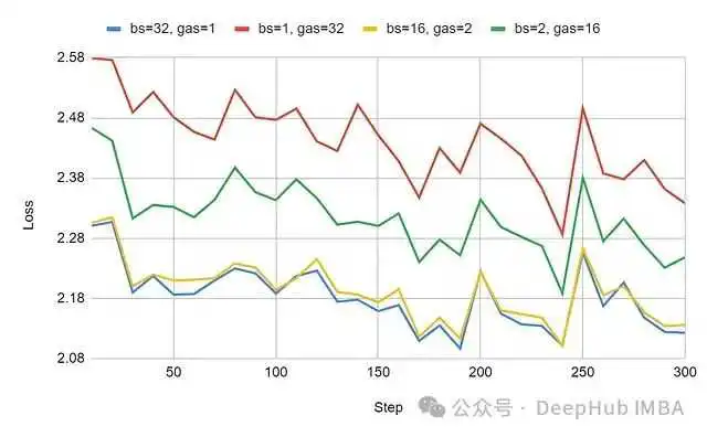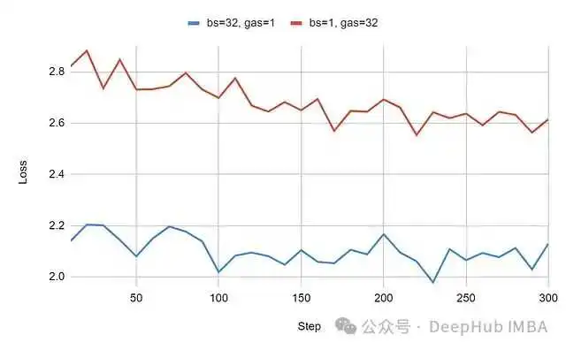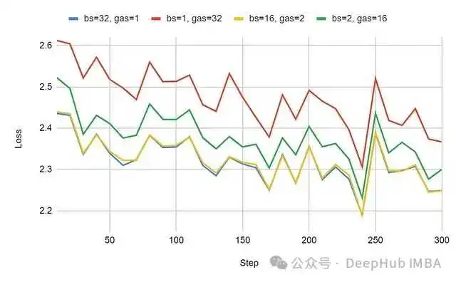 实验数据显示,批量大小(bs)为32与梯度累积步骤(gas)为32的配置间存在显著差异。当降低梯度累积步骤至16时,这种差异程度有所减小。