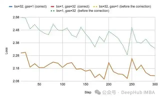 实验结果表明修正方案取得了预期效果:bs=32, gas=1配置与bs=1, gas=32配置的学习曲线实现了有效对齐。梯度累积的数学等价性得到了恢复。虽然在图中并不明显,但详细数据分析显示在某些训练步骤中仍存在最大约0.0004的微小差异,这可归因于AdamW量化过程中引入的数值近似计算误差。