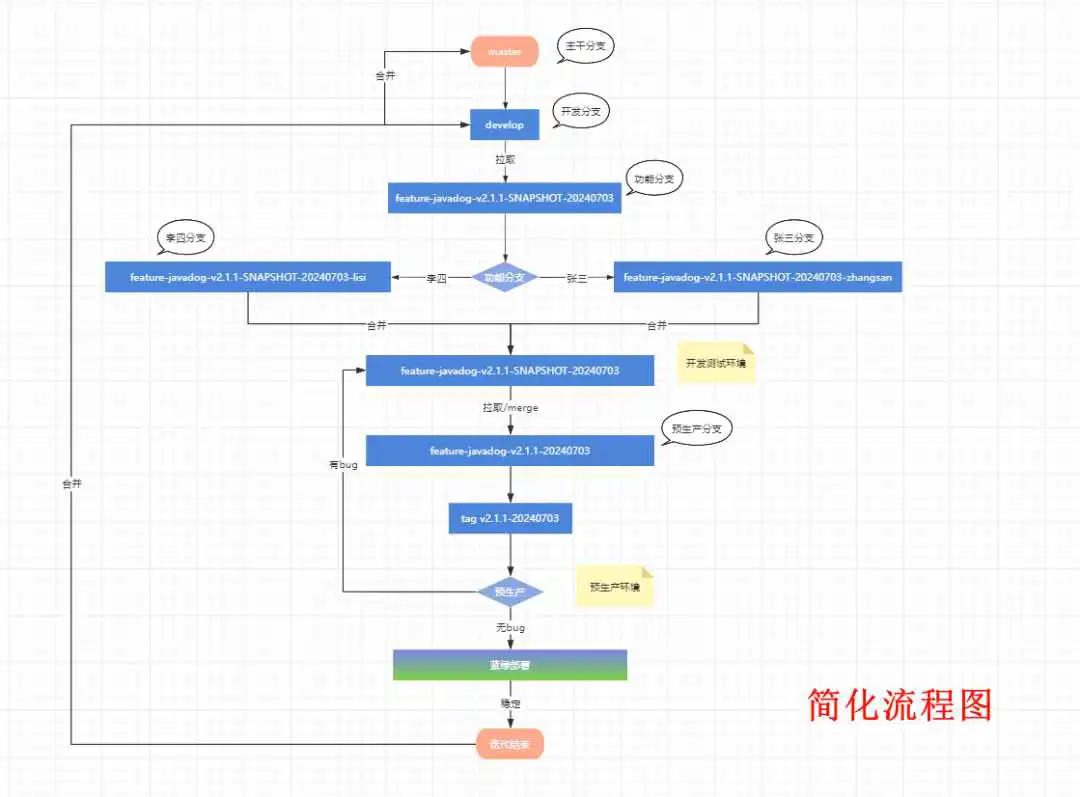 预生产准备:功能分支验证无误后,创建去除快照标识的预生产分支,用于模拟生产环境的最后测试。 -