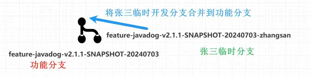 张三开发的模块A功能完成,本地调试正常后,将自己临时分支合并到功能分支,流水线由测试小姐姐打包功能分支feature-javadog-v2.1.1-SNAPSHOT-