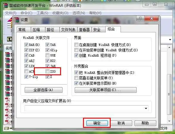 3.综合栏目→将WinRAR关联文件的ISO打钩→确定