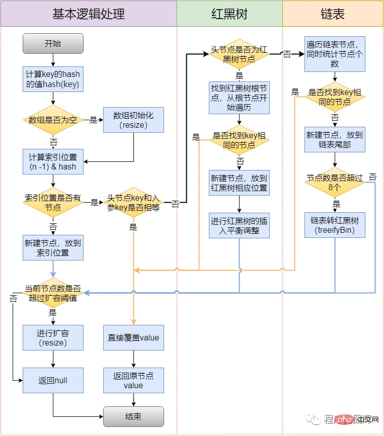 对于插入,默认情况下是使用链表节点。当同一个索引位置的节点在新增后超过8个(阈值8):如果此时数组长度大于等于 64,则会触发链表节点转红黑树节点(treeifyBin);而如果数组长度小于64,则不会触发链表转红黑树,而是会进行扩容,因为此时的数据量还比较小。
