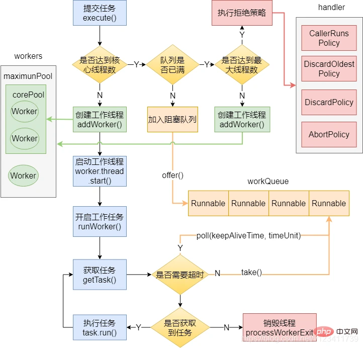 handler(拒绝策略):往线程池添加任务时,将在下面两种情况触发拒绝策略:1)线程池运行状态不是 RUNNING;2)线程池已经达到最大线程数,并且阻塞队列已满时。