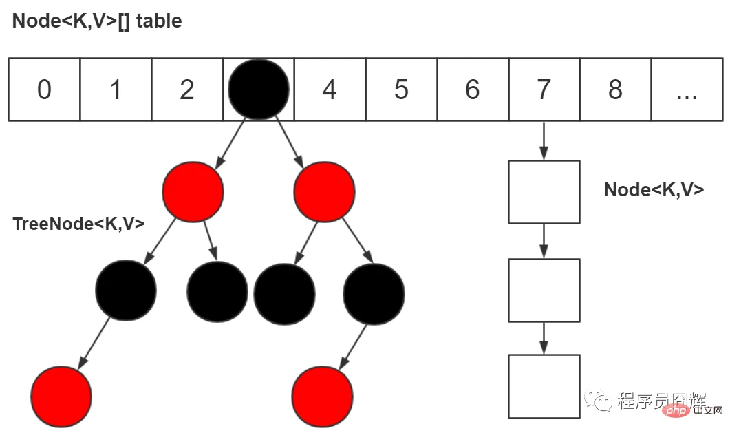 我们现在用的都是 JDK 1.8,底层是由“数组+链表+红黑树”组成,如下图,而在 JDK 1.8 之前是由“数组+链表”组成。