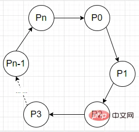 4)环路等待条件:存在一种进程资源的循环等待链,链中每一个进程已获得的资源同时被 链中下一个进程所请求。即存在一个处于等待状态的进程集合{Pl, P2, …, pn},其中 Pi 等待的资源被 P(i+1) 占有(i=0, 1, …, n-1),Pn 等待的资源被 P0占 有,如下图所示。