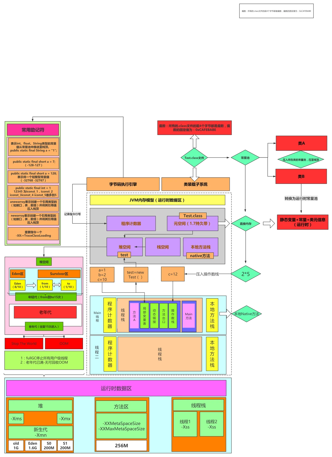 上面这张图,是本人花了很多心思总结出来的,基本涵盖了java内存模型的结构。今天奉上。这篇文章会把上面这张图讲清楚。