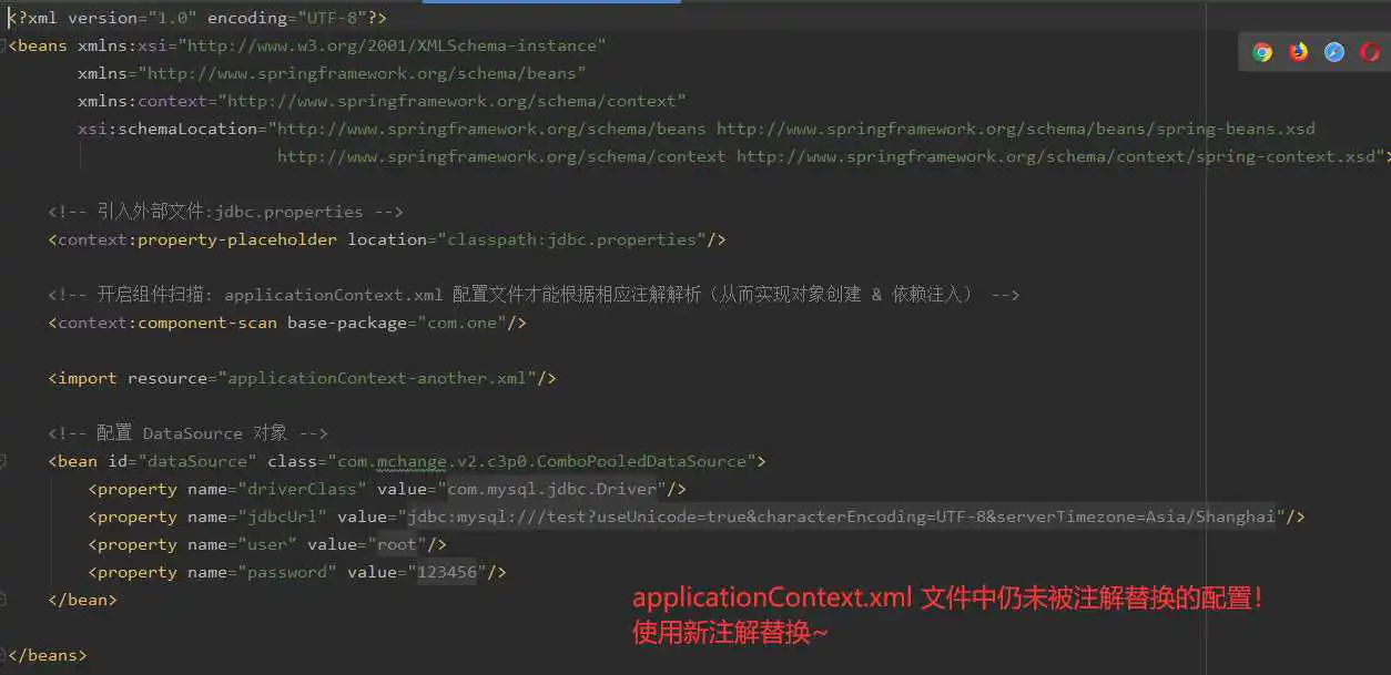 使用上面的注解还不能全部替代 xml 配置文件,还需要使用注解替代的配置如下: