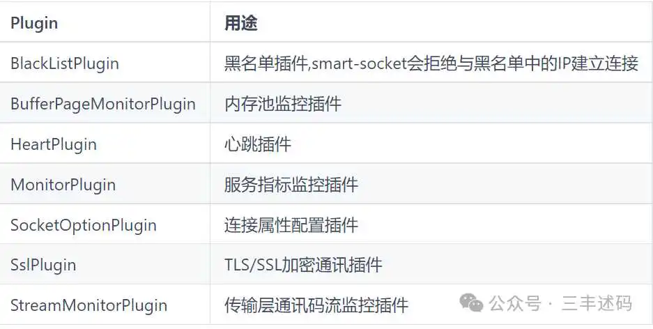 Smart-Socket支持自定义插件,并已提供了丰富的插件,包括SSL/TLS通信插件、心跳插件、断链重连插件、服务指标统计插件、黑名单插件、内存池监测插件等,这些插件可以方便地集成到框架中,以满足不同场景下的需求。