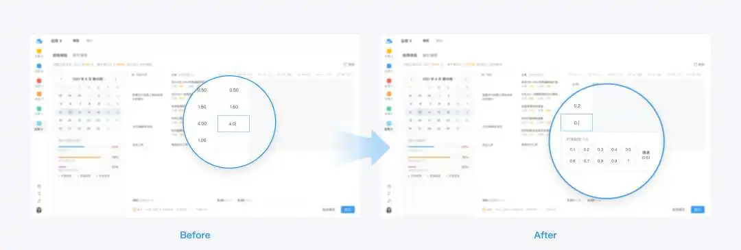 相信很多产品设计人员都清楚选择录入的优势远大于手动录入。在此之前,我们的工时填报页面,由于可输入信息精确到小数点后两位,所以我们常用的计步器、选择器、滑动输入等组件都无法在这里使用。对用户而言,手动逐项录入数据的操作成本非常高。