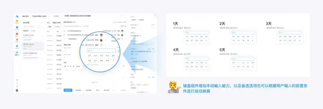数字键盘作为一种兼具选择录入便捷性和手动输入灵活性的数据录入组件,为不同类型的用户提供了高效、准确的数据录入体验,不仅提升了数据输入的便捷性和准确性,而且通过适应不同用户的操作习惯,增强了产品的普适性和用户满意度。继而我们也将数字键盘组件在其他使用场景进行了拓展,比如,其他场景下数字键盘上集成了手动录入的输入框,备选数据可以根据用户设置的起止日期进行自动计算,不仅帮助用户减轻了操作难度也极大节省了用户的时间成本。