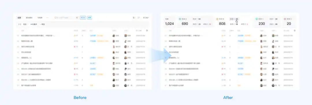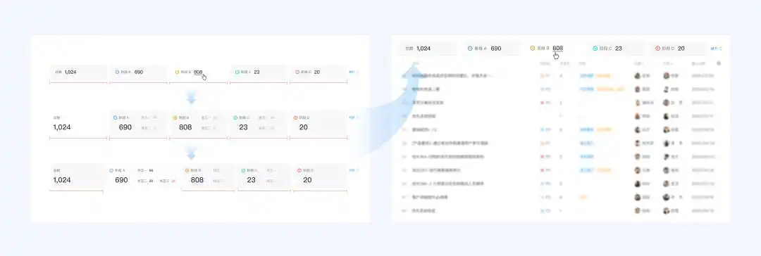在一些管理场景下会涉及到既需要查看各阶段下不同状态的概览数据,又需要查看详细数据的场景。按照以往的交互,用户可以用筛选器筛选出各阶段下不同状态数据再进行查看对比,虽然筛选器可以筛选出这些多阶段、多状态的数据,但存在着筛选步骤繁琐、多阶段&多状态的数据呈现都是棘手问题。