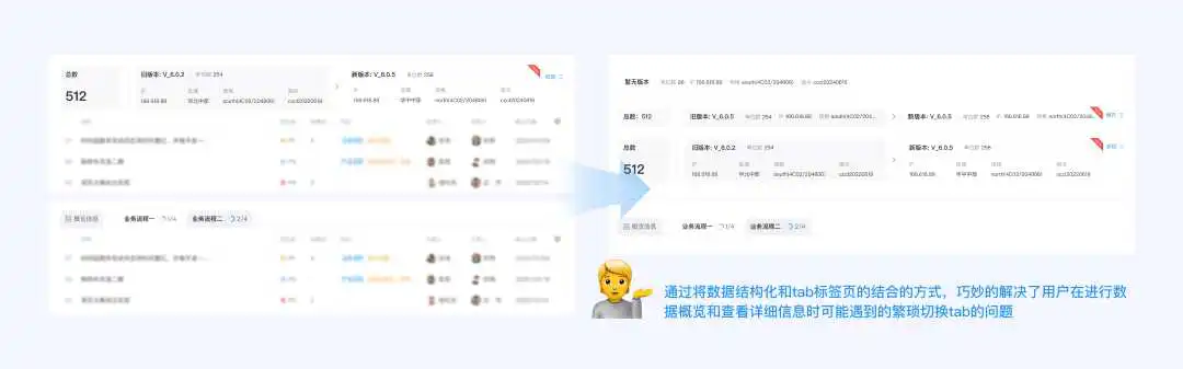 通过将数据结构化和tab标签页的结合的方式,巧妙的解决了用户在进行数据概览和查看详细信息时可能遇到的繁琐操作问题。这种模式不仅让页面信息结构更加清晰,用户无需跳转,即可在当前页面内,快速的查看概览及详情页信息。