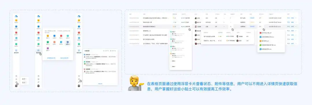 - 在表格页面通过使用【浮层卡片】查看状态、附件等信息,用户可以不用进入详情页快速获取信息,用户掌握好这些小贴士可以有效提高工作效率。