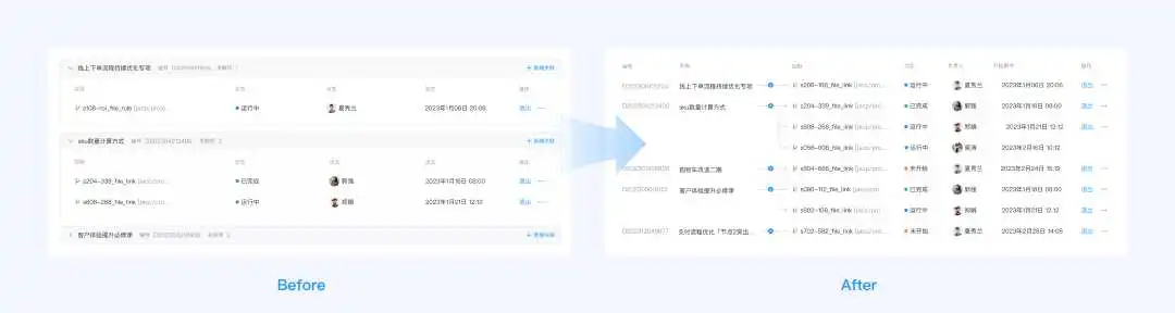 - 针对这样的复杂多维使用场景,我们在设计时借鉴了树形连接线来解决需求与开发分支的复杂关联关系,通过树形连接线将需求与开发分支进行串联,让复杂的关联关系一目了然。在解决了复杂的关联的同时,在连接线上增加了「新增」及在表格操作列增加了「操作列」的操作来解决编辑等扩展问题。
