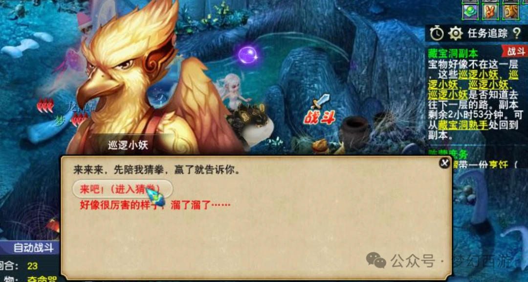 第二环:击败场景内的巡逻小妖,分战斗和猜拳两种模式。击败全部巡逻小妖后传送至第三层。