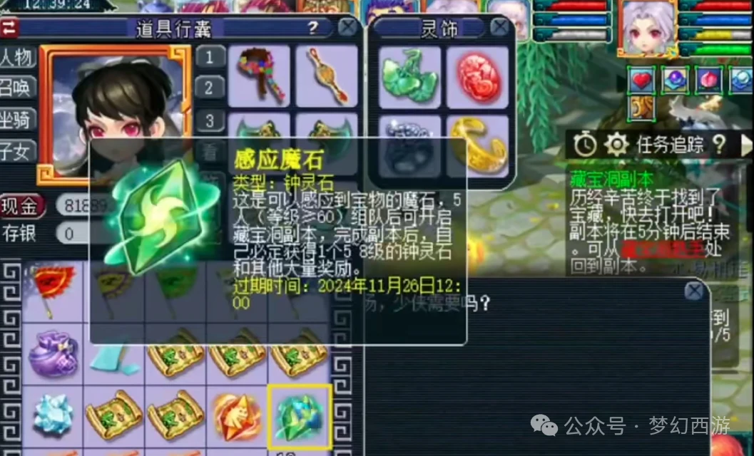 使用“感应魔石”可以开启限时副本“藏宝洞”(2024年11月26日12:00关闭)。不同颜色的钟灵石决定了不同的副本终极奖励。