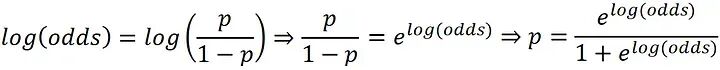 但为什么我们需要计算赔率的对数呢?如果我们将 ( p ) 设为0,赔率的对数为 ( -∞),如果将 ( p ) 设为1,赔率的对数为 ( +∞ )。概率 ( p ) 始终在0和1之间,但赔率的对数将其转换为 ( -∞ ) 到 ( +∞) 之间的实数。如果我们有了赔率的对数(log(odds)),我们可以使用以下公式来计算对应的概率: