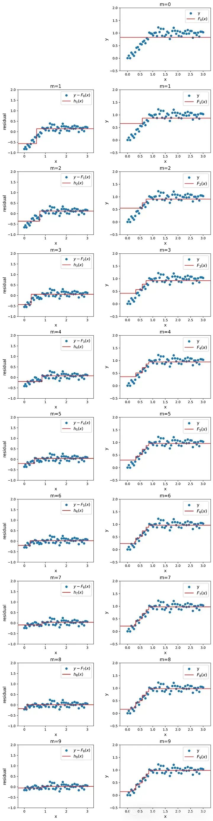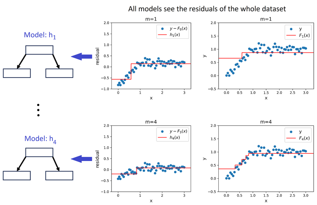 这个过程可以重复 M 次。每次都从前一个模型中计算训练数据集的残差,并训练决策树 ( h_m ) 来预测这些残差。因此,( h_m ) 以 x 为特征,以 ( y - p(x) ) 为目标。然后将这棵树的预测添加到前一个模型的预测中以改进它: