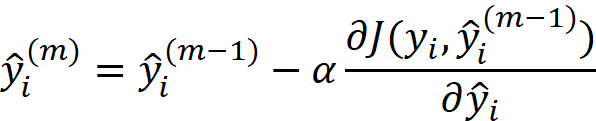 我们使用训练数据集来训练这个模型。如果我们用h_m(x)表示这个弱模型的预测,我们可以将梯度下降公式写成: