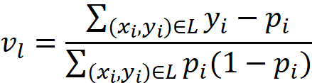 其中,L 是落在该叶子节点中的所有训练集示例的集合。我们用 ( (x_i, y_i) ) 表示L中的每个示例,( p_i ) 是预测特征 ( x_i ) 的目标等于1的概率。因此,分子是L中所有示例残差的和,分母是L中所有示例的 ( p(1-p) ) 的和。使用修改后的树,我们现在可以预测训练数据集中所有示例的目标。