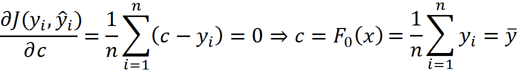 在梯度下降中,我们从参数的初始随机猜测开始,但在梯度提升中,我们做得更明智。我们的起点是一个常数值,它可以最小化训练数据集的平均成本函数。如果我们假设: