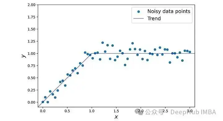 np.random.seed(4)x = np.linspace(0, 3, 60)x1 = np.linspace(0, 1, 20)x2 = np.linspace(1, 3, 40)y = x.copy()y[x>=1] = 1y = y + np.random.normal(scale=0.1, size=60)X = x.reshape(-1, 1)plt.figure(figsize=(8,8))plt.scatter(x, y, label="Noisy data points")plt.plot(x1, x1, color="blue", alpha=0.5, label="Trend")plt.plot(x2, len(x2)*[1], color="blue", alpha=0.5)plt.xlim([-0.1, 3.1])plt.ylim([-0.1, 2])plt.xlabel('$x$', fontsize=16)plt.ylabel('$y$', fontsize=16)ax = plt.gca()ax.set_aspect('equal')plt.legend(loc="best", fontsize=14)plt.show()