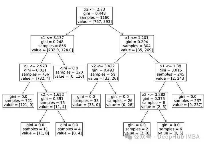 def plot_boundary_lines(tree_model):def helper(node, x1_min, x1_max, x2_min, x2_max):if feature[node] == 0:plt.plot([threshold[node], threshold[node]],[x2_min, x2_max], color="black")if feature[node] == 1:plt.plot([x1_min, x1_max], [threshold[node],threshold[node]], color="black")if children_left[node] != children_right[node]:if feature[node] == 0:helper(children_left[node], x1_min,threshold[node], x2_min, x2_max)helper(children_right[node], threshold[node],x1_max, x2_min, x2_max)else:helper(children_left[node], x1_min, x1_max,x2_min, threshold[node])helper(children_right[node], x1_min, x1_max,threshold[node], x2_max)feature = tree_model.tree_.featurethreshold = tree_model.tree_.thresholdchildren_left = tree_model.tree_.children_leftchildren_right = tree_model.tree_.children_rightx1_min = x2_min = -1x1_max = x2_max = 5helper(0, x1_min, x1_max, x2_min, x2_max)