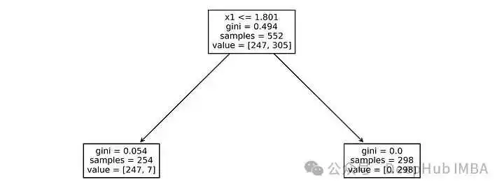 tree_clf1 = DecisionTreeClassifier(random_state=1, max_depth=1)tree_clf1.fit(X, y)plt.figure(figsize=(10,5))tree.plot_tree(tree_clf1, fontsize=9, feature_names=["x1", "x2"])plt.show()
