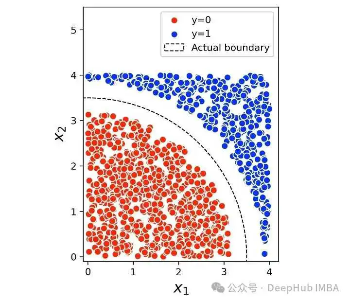 import pandas as pdimport numpy as npimport matplotlib.pyplot as pltfrom sklearn.tree import DecisionTreeClassifierfrom sklearn.tree import DecisionTreeRegressorfrom sklearn import treefrom matplotlib.colors import ListedColormapnp.random.seed(7)low_r = 10high_r = 15n = 1550X = np.random.uniform(low=[0, 0], high=[4, 4], size=(n,2))drop = (X[:, 0]2 + X[:, 1]2 > low_r) & (X[:, 0]2 + X[:, 1]2 < high_r)X = X[~drop]y = (X[:, 0]2 + X[:, 1]2 >= high_r).astype(int)colors = ['red', 'blue']plt.figure(figsize=(6, 6))for i in np.unique(y):plt.scatter(X[y==i, 0], X[y==i, 1], label = "y="+str(i),color=colors[i], edgecolor="white", s=50)circle = plt.Circle((0, 0), 3.5, color='black', fill=False,linestyle="--", label="Actual boundary")plt.xlim([-0.1, 4.2])plt.ylim([-0.1, 5])ax = plt.gca()ax.set_aspect('equal')ax.add_patch(circle)plt.xlabel('$x_1$', fontsize=16)plt.ylabel('$x_2$', fontsize=16)plt.legend(loc='best', fontsize=11)plt.show()