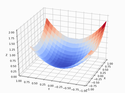 要想理解这个概念,请看下图。在曲面的任何一点,我们都能够定义一个与其相切的平面。在更高维度,我们总能够定义一个超平面,但在这里我们还是坚持使用 3 维空间。然后,在这个平面上有无限个方向。其中,准确来说只有一个使函数上升最快的方向,这个方向由梯度给出,与之相反的方向就是下降最快的方向。这就是算法名称的来源,我们沿着梯度的方向进行下降,所以就叫做梯度下降。