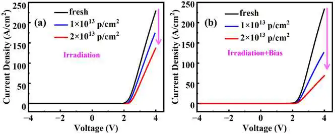 图1 β-Ga2O3 p-n二极管的I-V特性曲线。(a)质子辐照前后;(b)质子辐照和-100 V电偏压耦合前后