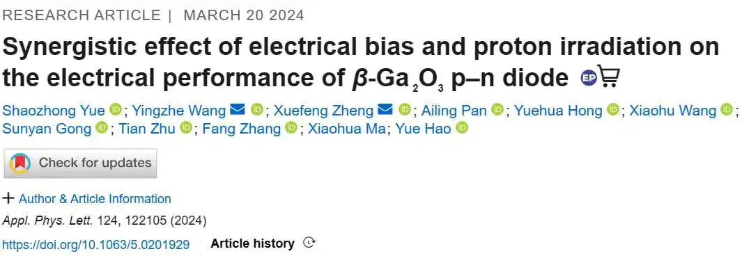 西安电子科技大学郝跃院士课题组马晓华、郑雪峰教授团队实验首次研究了β-Ga2O3 p-n二极管在质子辐射和电应力协同作用下的退化规律及其物理机制,在Applied Physic Letters上发表了题为“Synergistic Effect of Electrical Bias and Proton Irradiation on the Electrical Performance of β-Ga2O3 p-n Diode”的研究论文,该论文被选为Editor's Pick(编辑精选),西安电子科技大学岳少忠博士为论文的第一作者,西安电子科技大学郑雪峰教授和王颖哲副教授为论文的共同通讯作者。