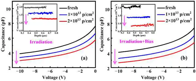 图2 β-Ga2O3 p-n二极管的C-V特性及提取的器件净载流子浓度。(a)质子辐照前后;(b)质子辐照和-100V电偏压耦合前后