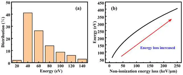 当在-100 V电偏压与质子辐照协同作用时,与纯辐照下相比,Ga空位缺陷浓度增加得更加显著,这与正向饱和电流的下降一致。更有趣的是,小剂量质子辐照与电偏压协同作用后,相比于纯质子辐照而言,缺陷浓度增加更加显著,正向饱和电流下降同样更加显著。针对此现象,针对电场下反冲核的行为进行了仿真。研究表明,电偏压使得质子辐射位移效应产生的反冲核被赋能,引起核能损进一步显著增加(如图4),对Ga2O3器件造成二次损伤,是质子辐照和电偏压耦合产生更多缺陷且退化更显著的关键原因。