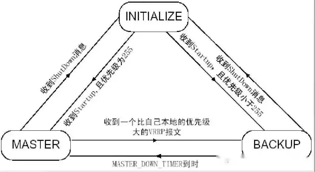 (1)初始状态initial:VRRP启动时的状态,VRRP 还没有运行,一般是改变配置或端口刚启动时进入该状态。