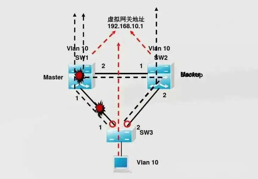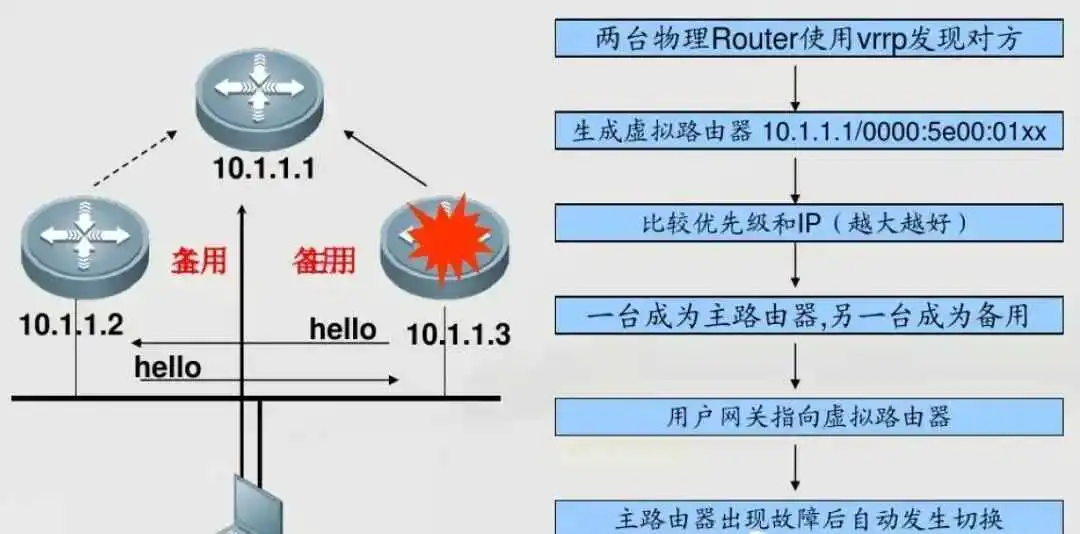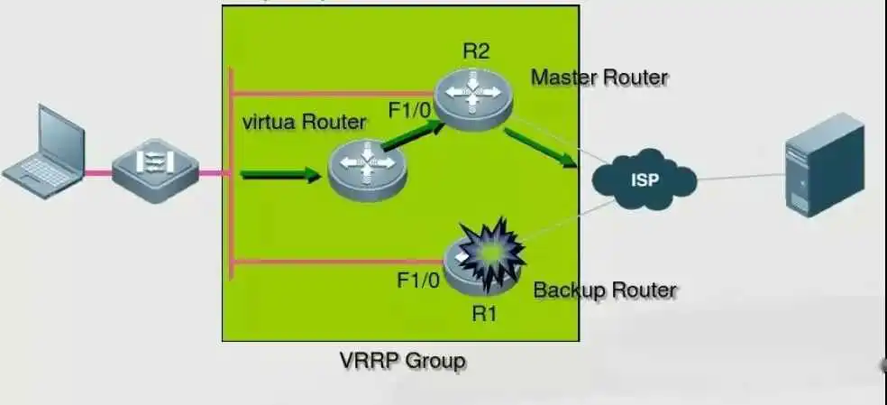 当缺省路由器down掉(即端口关闭)之后,内部主机将无法与外部通信,如果路由器设置了VRRP时,那么这时,虚拟路由将启用备份路由器,从而实现全网通信。