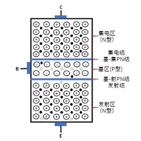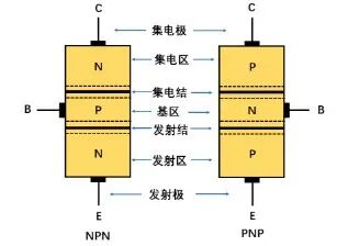 由三个相邻互不相同的杂质半导体叠加起来,就形成了三极管的基本结构。从三个杂质半导体区域各引出一个电极,我们分别将其称之为发射极(Emitter)、集电极(Collector)、基极(Base);而对应的区域分别称为发射区、集电区、基区;相邻的两个不同类型的杂质半导体将形成PN结,我们把发射区与基区之间的PN结称之为发射结,而把基区与集电区之间的PN结称之为集电结。