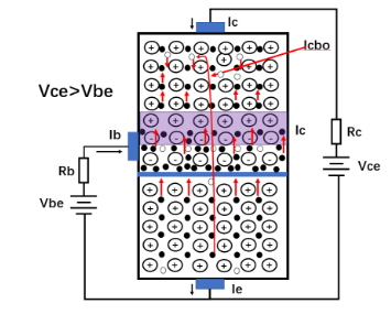 在多数载流子电子进入到集电区后,集电区(N型)的少数载流子空穴与基区(P型)的少数载流子电子也会产生漂移运动,形成了电流Icbo,而另有一些会跨过基区到达发射区从而形成Iceo,如图9所示。