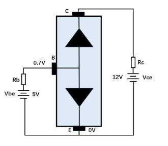 在电压连接的一瞬间,假设基-射(发射结)偏置电压Vbe=5V,而集-射极偏置电压Vce=12V,两个N型半导体与P型半导体形成了两个PN结,BE结(发射结)正向电压偏置而导通将基极电位限制在0.7V(硅管),而集电极电位由于PN结反向偏置截止而为12V(瞬间电位,此时集电极电流还没有),如图5所示。